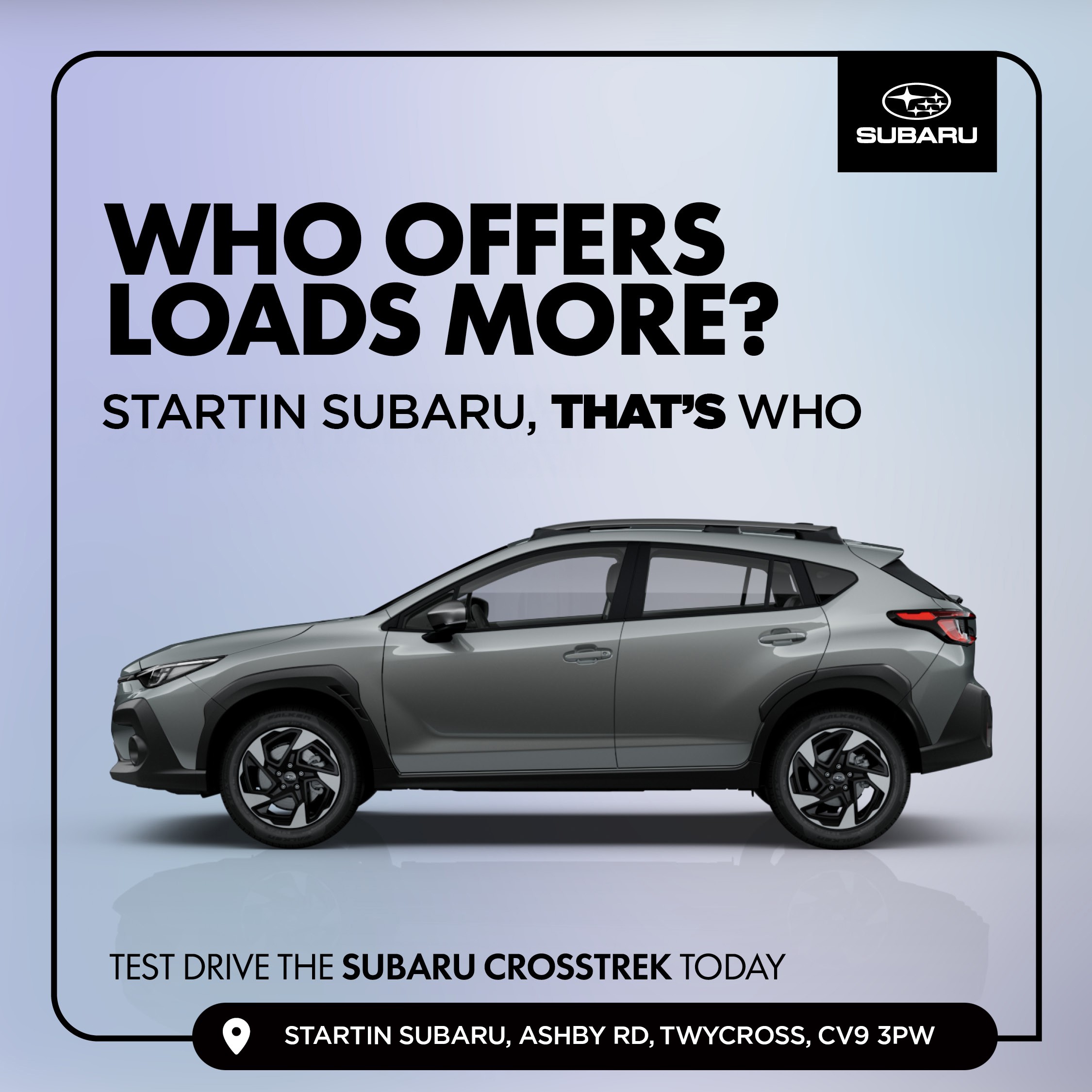 Startin Subaru, a trading name of Startin Tractors Limited, is authorised and regulated by the Finance Conduct Authority (FCA No 669694) to act as a credit broker, not a lender for the introduction to a limited number of lenders as detailed in our status disclosure document.